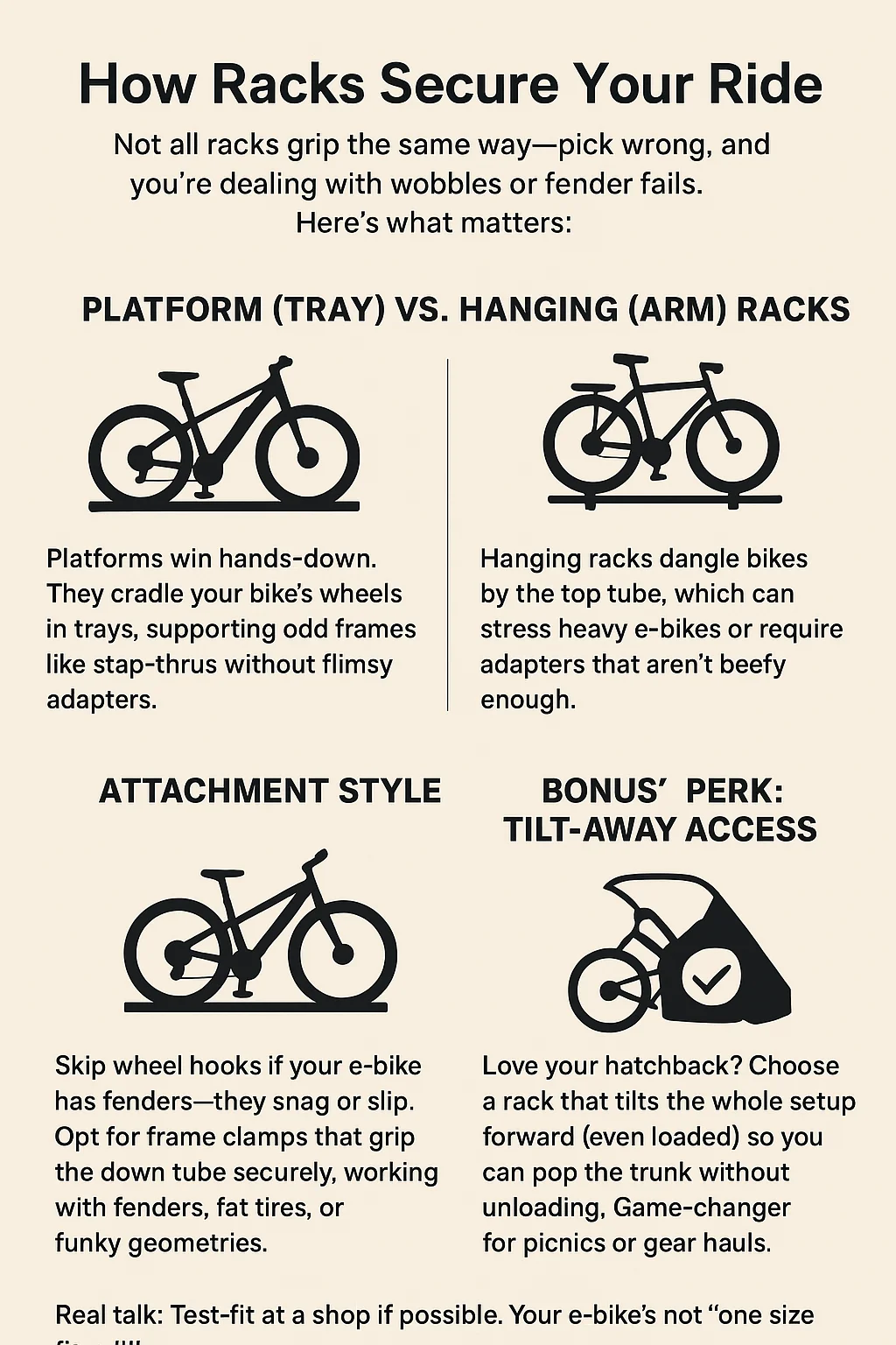 Standard roof or trunk racks just don’t cut it for electric bikes. They’re not designed for heavy frames or fat tires, and they often risk damage or instability.